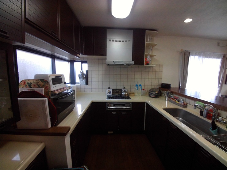 リフォーム前のコの字型キッチンをリビング側から見た写真。写真では分かりづらいのですが天窓が吊戸棚で塞がれています。
