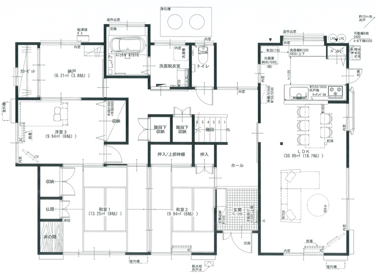 | リフォーム内容 | 【玄関/ホール】フローリング、壁紙、玄関ドア他 【LDK】フローリング、壁紙、システムキッチン、食器棚、間取り変更他 【トイレ】クッションフロア、壁紙、便器他 【洗面所】クッションフロア、壁紙、洗面台他 【浴室】タイル風呂をユニットバスへ、給湯器 【お母様寝室】和室を洋室へ、押入をクローゼットへ他 【納戸】和室を洋室へ、クローゼットの新設他 【その他】工事範囲全体の内窓取付・建具交換、浴室サッシ交換、勝手口戸交換・玄関ドア交換、断熱材、井戸水→上水切替、浄化槽土間コン他 |