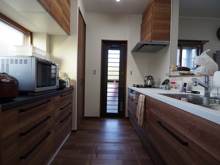工事後のキッチン(クリナップ/ラクエラW2550/食器棚もラクエラW1500)勝手口戸は交換しています