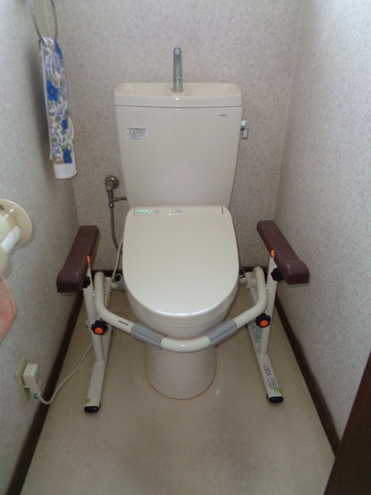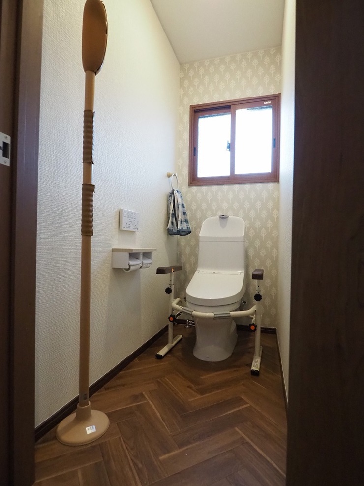 リフォーム後のトイレ、幅広の外開き戸になり出入りが楽に。手摺類は当初造り付けにしようとしましたが微調整出来る据え置き型へ(便器/TOTO)