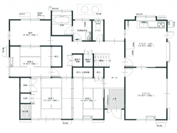 | リフォーム内容 | 【玄関/ホール】フローリング、壁紙、玄関ドア他 【LDK】フローリング、壁紙、システムキッチン、食器棚、間取り変更他 【トイレ】クッションフロア、壁紙、便器他 【洗面所】クッションフロア、壁紙、洗面台他 【浴室】タイル風呂をユニットバスへ、給湯器 【お母様寝室】和室を洋室へ、押入をクローゼットへ他 【納戸】和室を洋室へ、クローゼットの新設他 【その他】工事範囲全体の内窓取付・建具交換、浴室サッシ交換、勝手口戸交換・玄関ドア交換、断熱材、井戸水→上水切替、浄化槽土間コン他 |