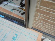 職人さんが既存の枠の内側に新しい枠を取付中です。